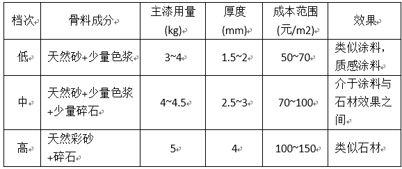 施工价:单彩、多彩、岩片一般在40元/m2以内。